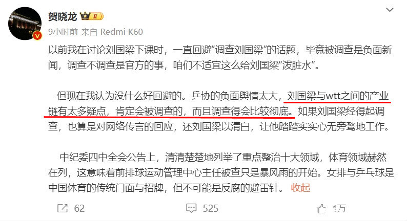 最后,至于这条反腐主线里最终会不会查到中国乒协主席刘国梁,贺晓龙也直言不讳地表示,如今中国乒协的负面舆论太大了,再加上刘国梁与WTT产业链的确存在很多疑点,所以他认为刘国梁后续肯定会被调查,而且还会被查得很彻底!